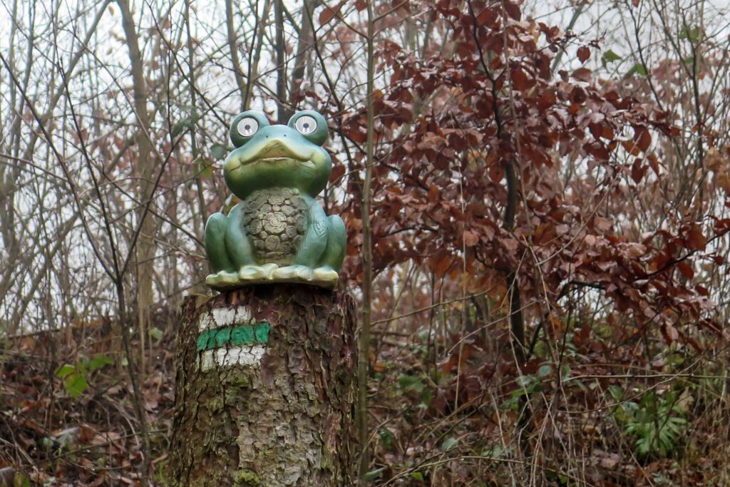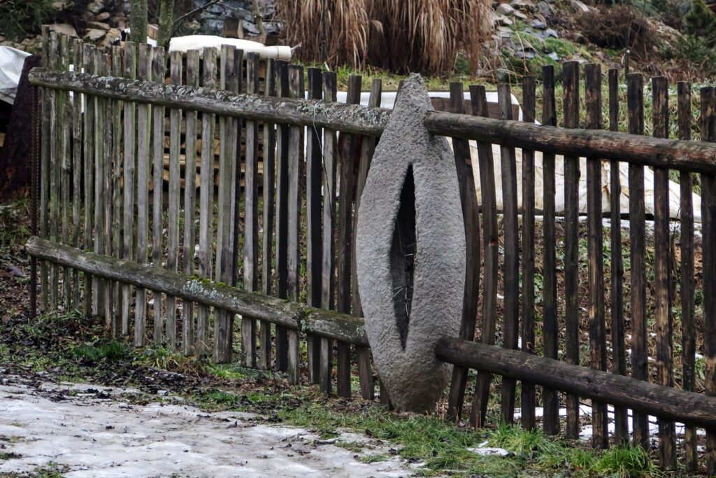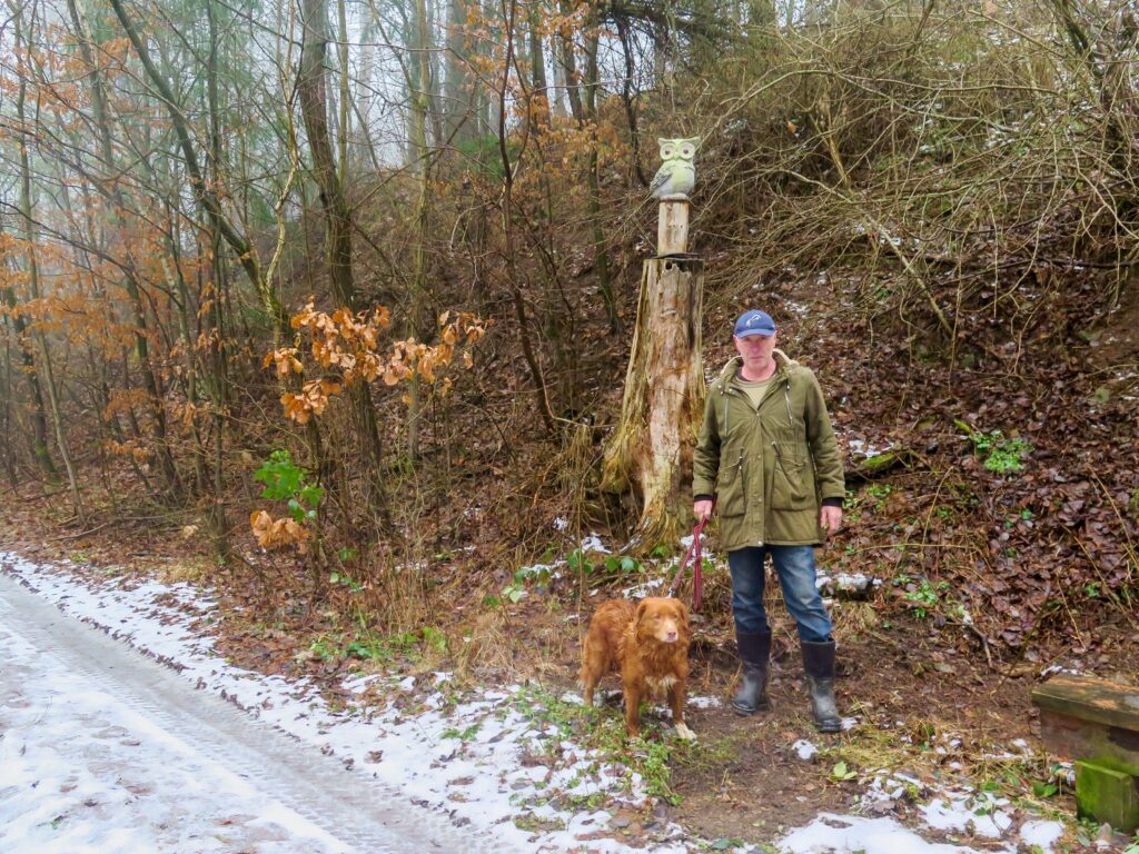 Nad domy začíná být cesta pokrytá zledovatělou krustou. Jde se docela blbě. Kousek výš narážíme na různá zvířata z keramiky posazená na pahýly stromů. Je to trochu kýč, ale nám se líbí. Okolo jde pán se psem. Zdravíme se a on nám vykládá, že to tu rozmisťuje on. Dobrá haluz, potkat autora. Milan toho využívá a pana Starého si fotí.