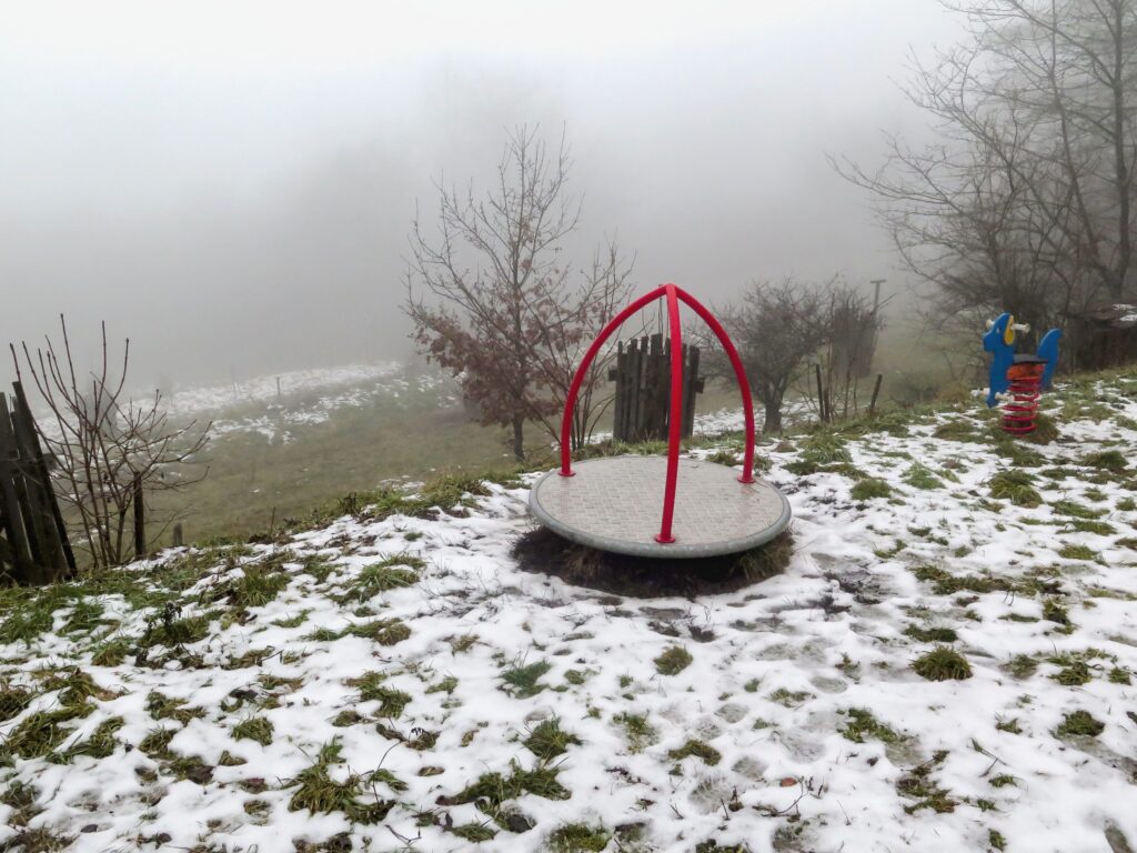 U tohoto kolotoče, kam chodí mateřská školka, se bavíme představou, jak místní děti odlétávají pryč a rovnou se kutálí ze svahu dolů. Drsný vesnický život.