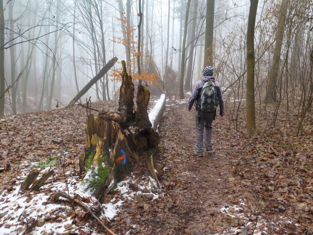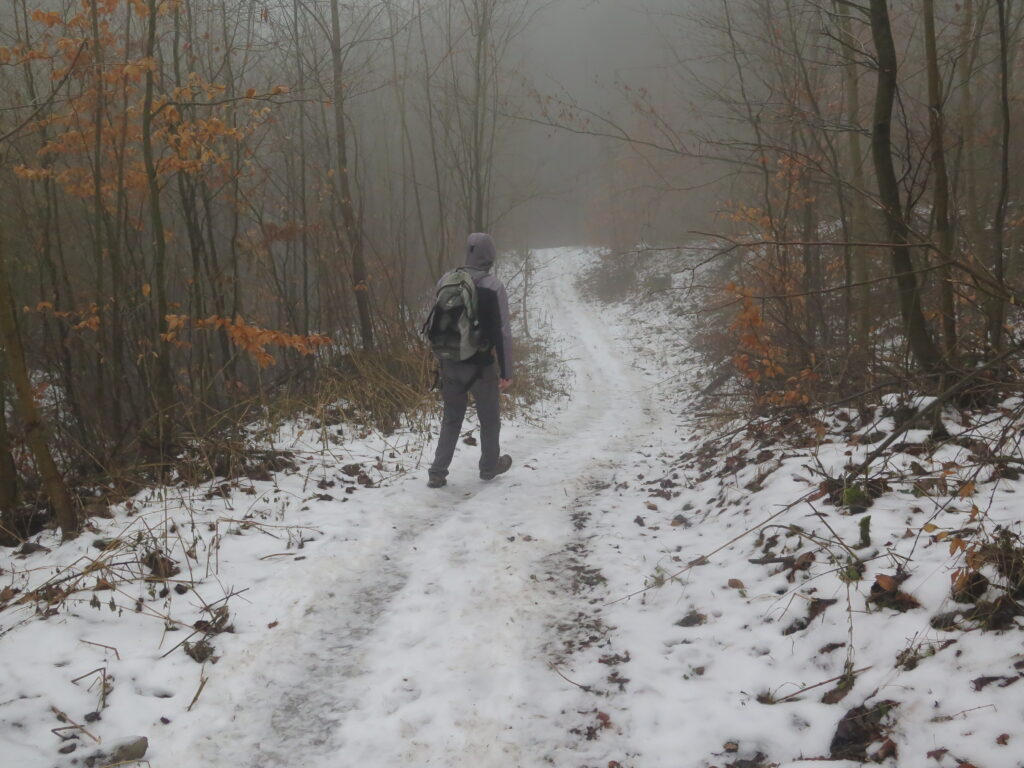 Směrem od rozhledny nás čeká to modré klesání. Jde se hodně těžce, tady je v lese námraza, cestička to není bůhvíjaká, a tak se zachytáváme kmínků okolo a částečně kloužeme dolů.