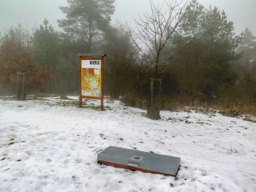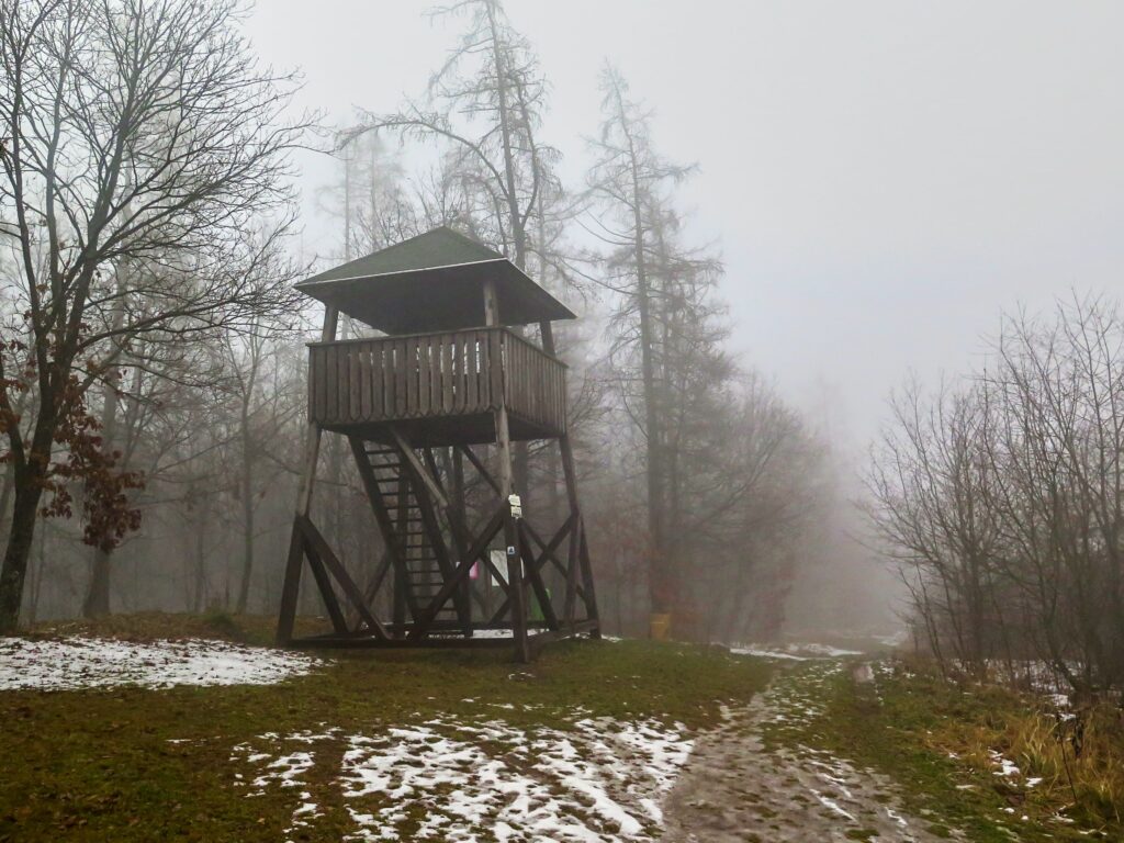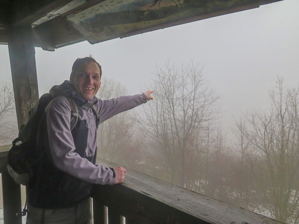 Rozhledna je pěkná, menší, dřevěná. I přes zákaz, že je v zimě zavřená, nám to nedá a lezeme do patra. Tak podle orientační tabule s popisy okolních kopců tušíme, co bychom viděli. Ale já s nadšením ukazuju do mlhy…