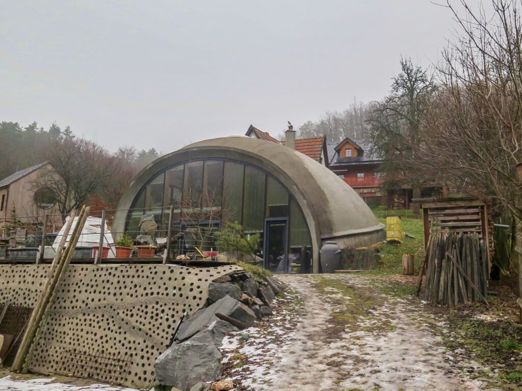 No a pak vcházíme do Zahrady. Řeklo by se obyčejná vesnice, ale stavby na protějším svahu nás dostávají do kolen. Vypadá to jako nějaký show-room úchylného stavitele. Mezi docela všedními a obyčejnými venkovskými domy tu stojí několik takových, které jsou hodně zvláštní. Jeden vypadá jako ukrojená dělová koule, druhý má zvláštně tvarovanou střechu, další má obří kulaté okno ve stěně… Zajímavé. Ještě nějakou chvíli nám zabere debatování nad tím, kdo to postavil, komu to patří a k čemu to celé je.